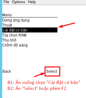 Bước 2: Chọn “menu” hoặc ấn vào phím F1