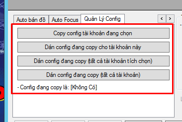 + Tính năng Copy Config => Bạn có thể cài sẵn 1 acc , sau đó copy thông tin cài đặt acc đó cho 1 acc khác , hoặc copy cho tất cả các acc, thao tác chỉ cần 1 click